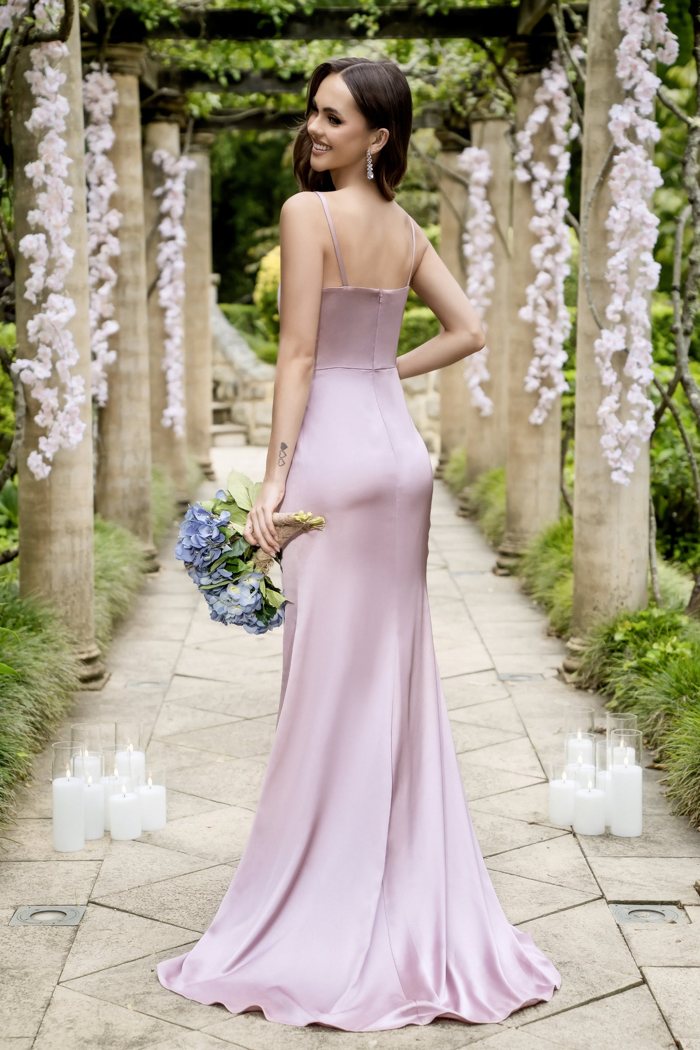 Introducing the Ameera‚ a stunning blend of timeless elegance and modern sophistication, perfect for the chic bridesmaid. Featuring a classic sweetheart neckline with delicate thin straps, this gown beautifully frames the shoulders for a graceful, feminine look. The artful ruching at the stomach enhances your natural curves, while the daring high slit adds a touch of drama and effortless glamour.
