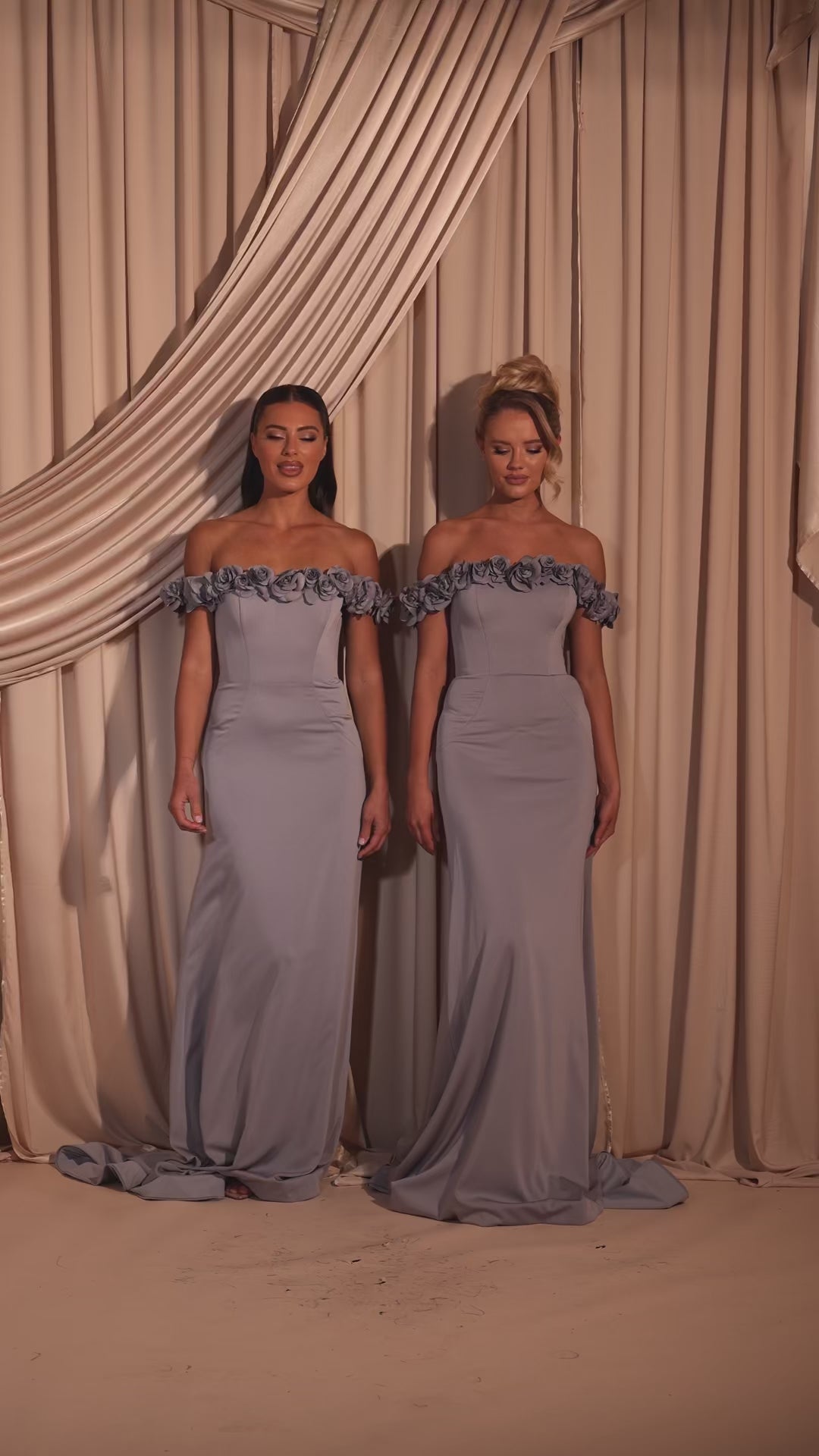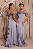 The Brielle Gown is crafted from stretch satin and features an off-shoulder neckline adorned with 3D floral detailing. The fitted bodice flows into a smooth, floor-length skirt with a soft train, creating a flattering and romantic silhouette. Perfect for bridesmaids seeking a timeless look with a touch of elegance.