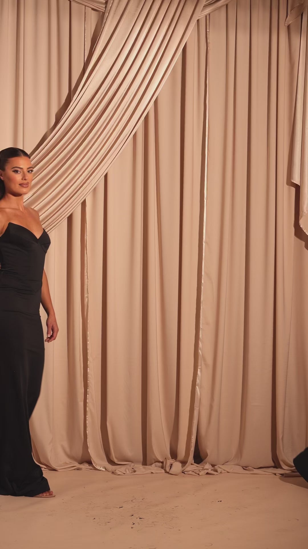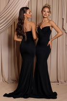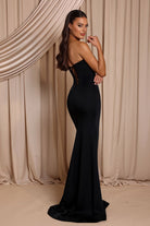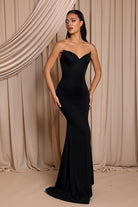 The Camilla Gown is made from stretch satin and features a sculpted strapless neckline with defined bust cups for a structured fit. The figure-hugging silhouette flows into a flared hem with a small train, while the lace-up back adds an elegant finishing touch. A sleek and modern option for bridesmaids or formal events.
