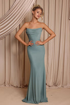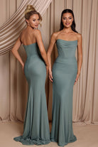 The Cora Gown is made from stretch chiffon and features a softly draped neckline with subtle pleating at the waist for a flattering fit. The slim, floor-length silhouette flows into a gentle train, offering a timeless and elegant look ideal for bridesmaids or formal occasions.