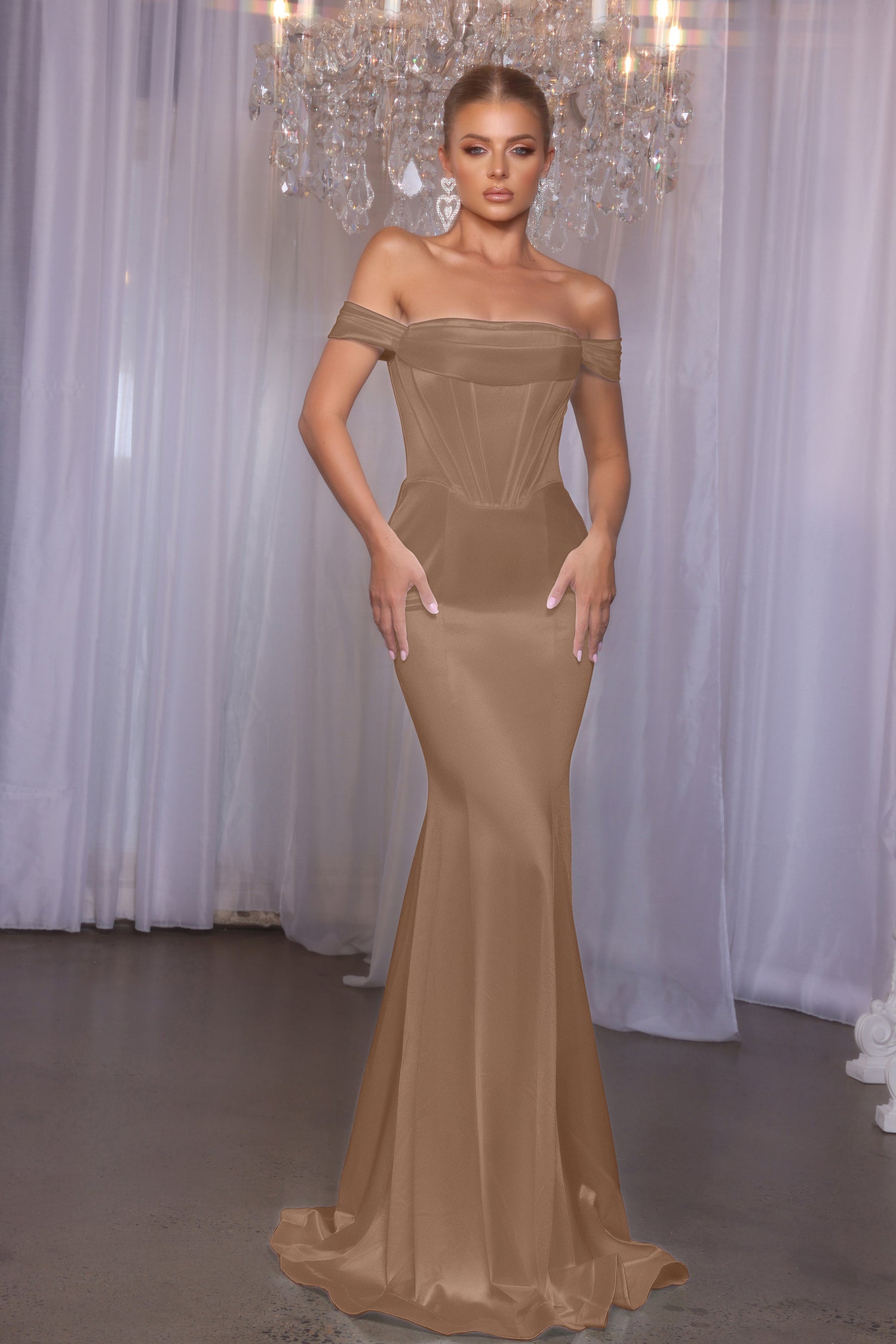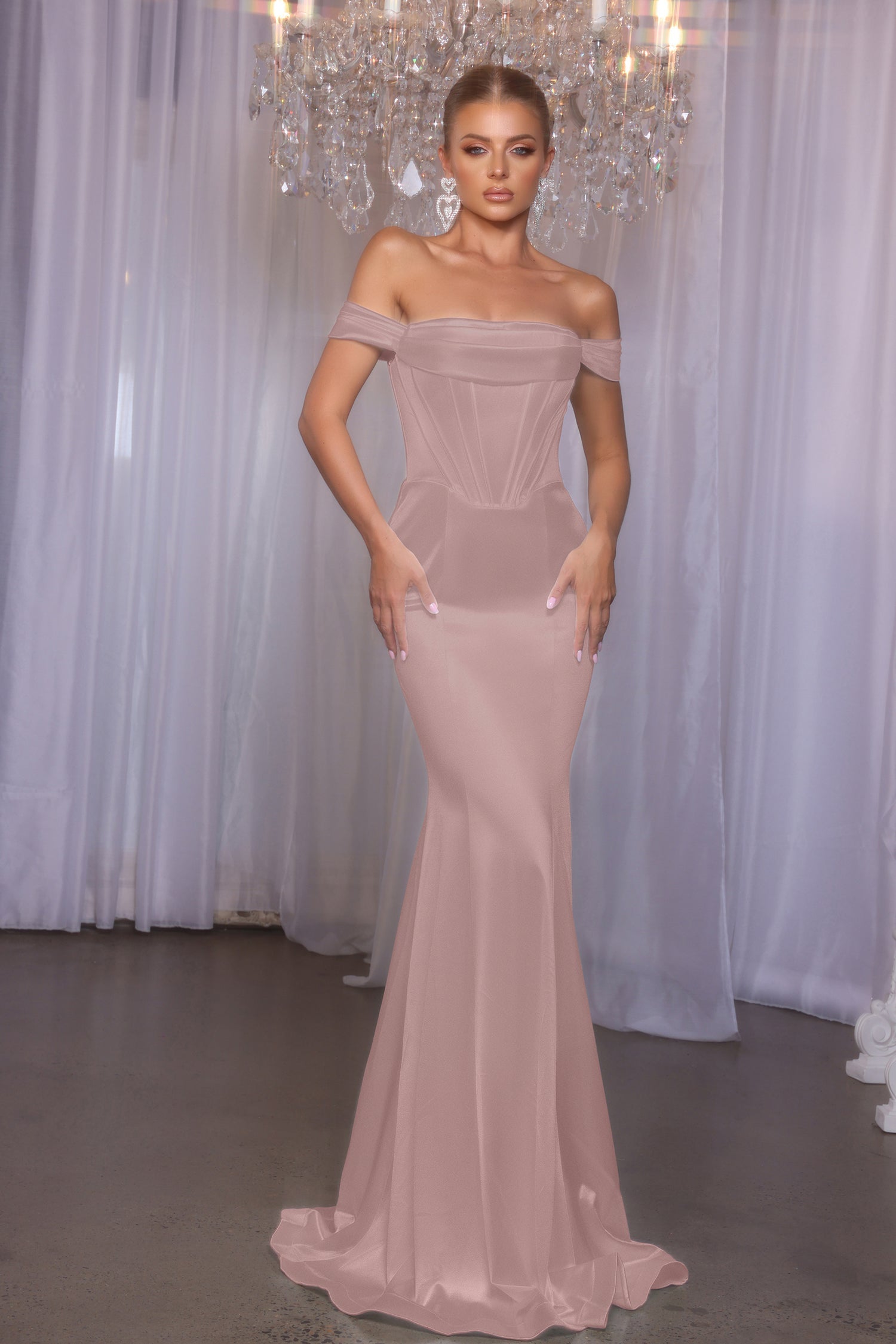 Meet the Eleanor, an exquisite choice that effortlessly blends sophistication and style for your bridal party. Featuring a sweetheart-shaped bodice with draped off-the-shoulder straps, this stunning dress boasts visible boning for added structure and a flattering fit. The sleek, fitted floor-length design and subtle train at the back exude grace and charm, while the stretch ensures comfort and confidence. Let your bridesmaids shine in the refined beauty of the Eleanor on your special day!