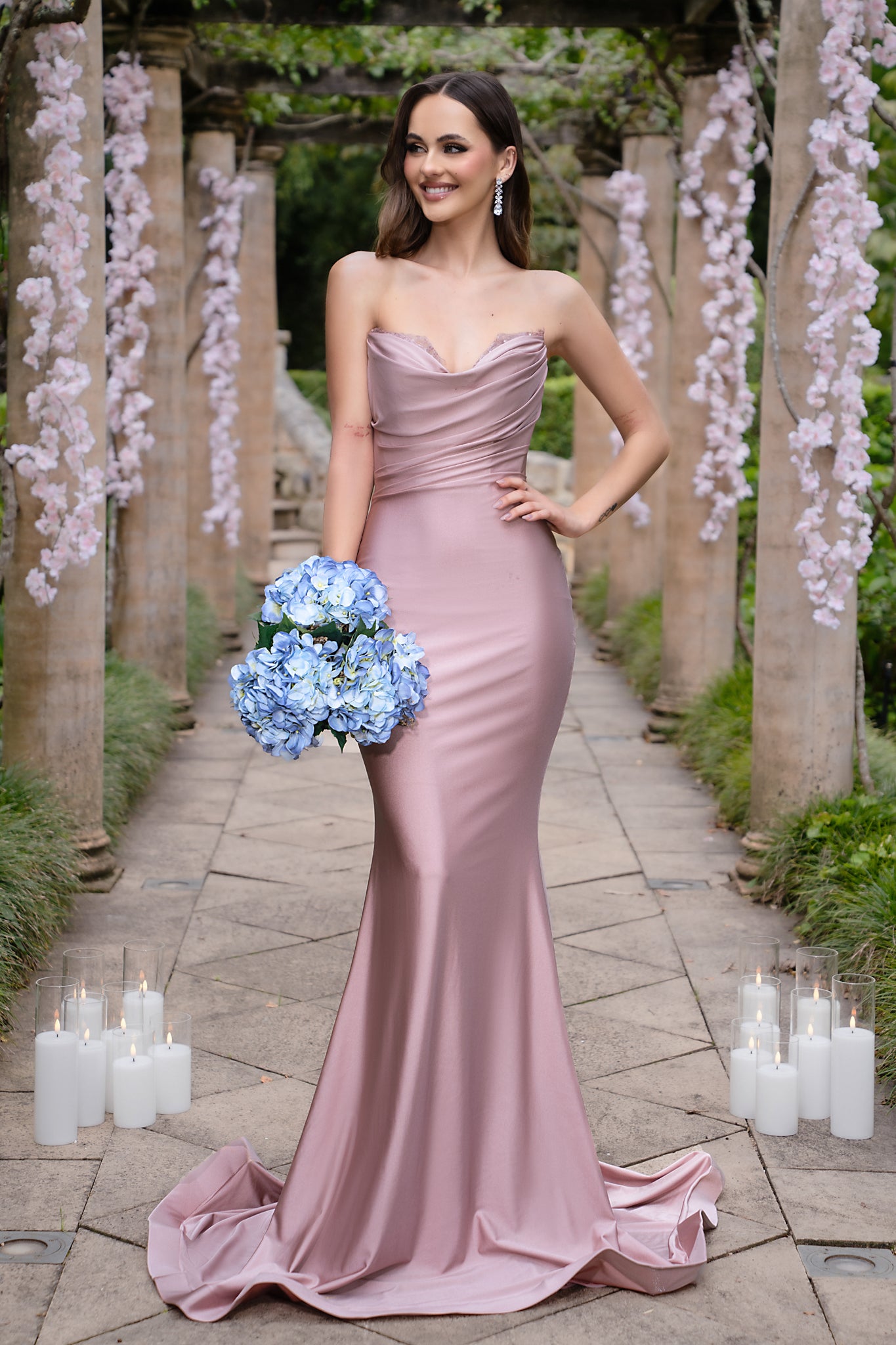 Introducing the Gabriella, a stunning choice for your bridal party that radiates elegance and charm. This strapless, sweetheart-shaped gown features a flattering mermaid silhouette that beautifully hugs the curves and flows into a subtle train at the back. Adorned with exquisite lace trim across the bodice, the Gabriella adds a touch of romance and sophistication. With its high stretch fabric, this gown ensures your bridesmaids will feel comfortable and confident while celebrating your special day. Let the Gabriella be the perfect blend of style and grace for your wedding!