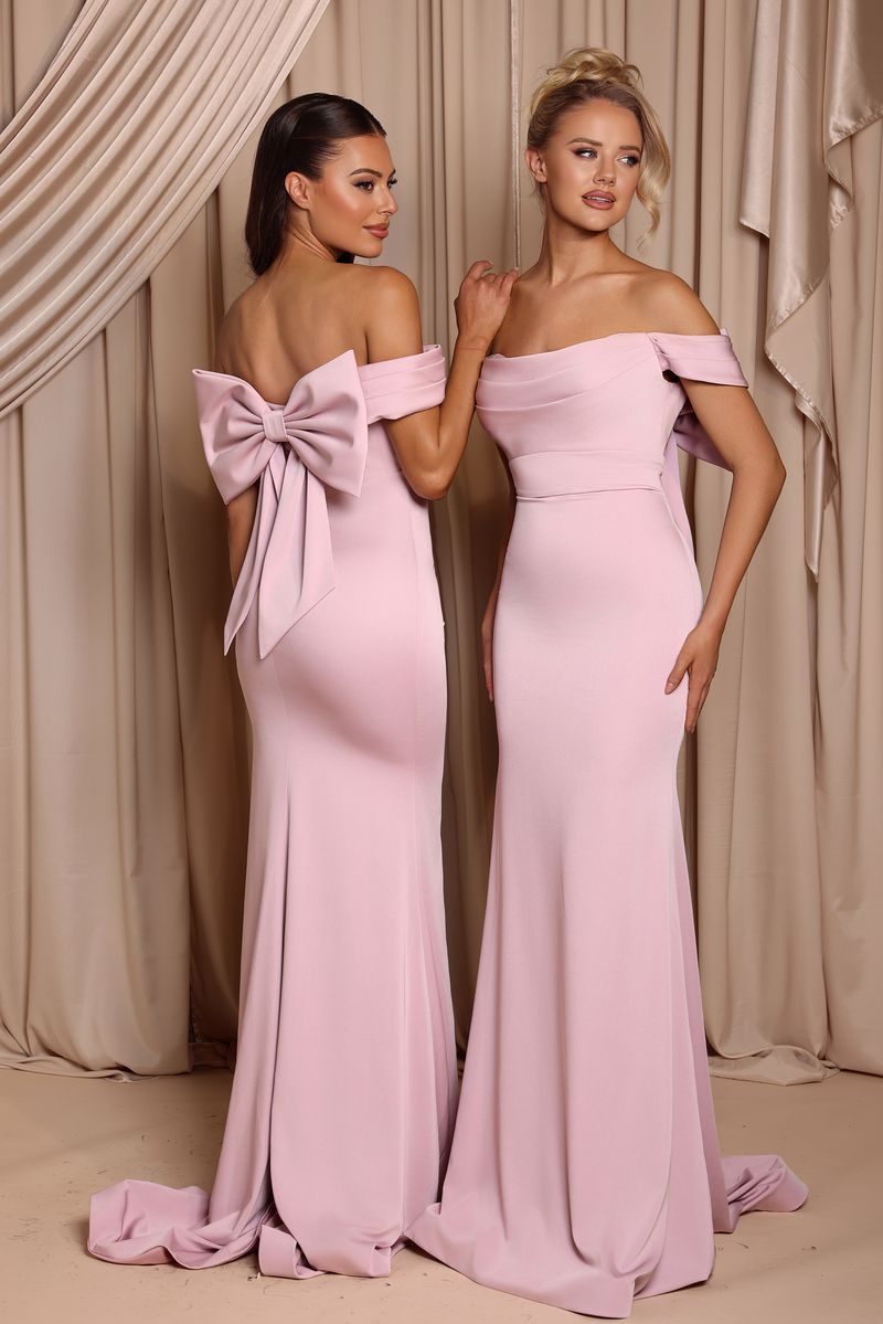 The Harper Gown is crafted from stretch satin and features an off-shoulder neckline with folded detailing for a sleek finish. The fitted silhouette highlights the figure, flowing into a soft train, while a statement bow at the back adds a romantic touch. A graceful and feminine choice for modern bridesmaids..