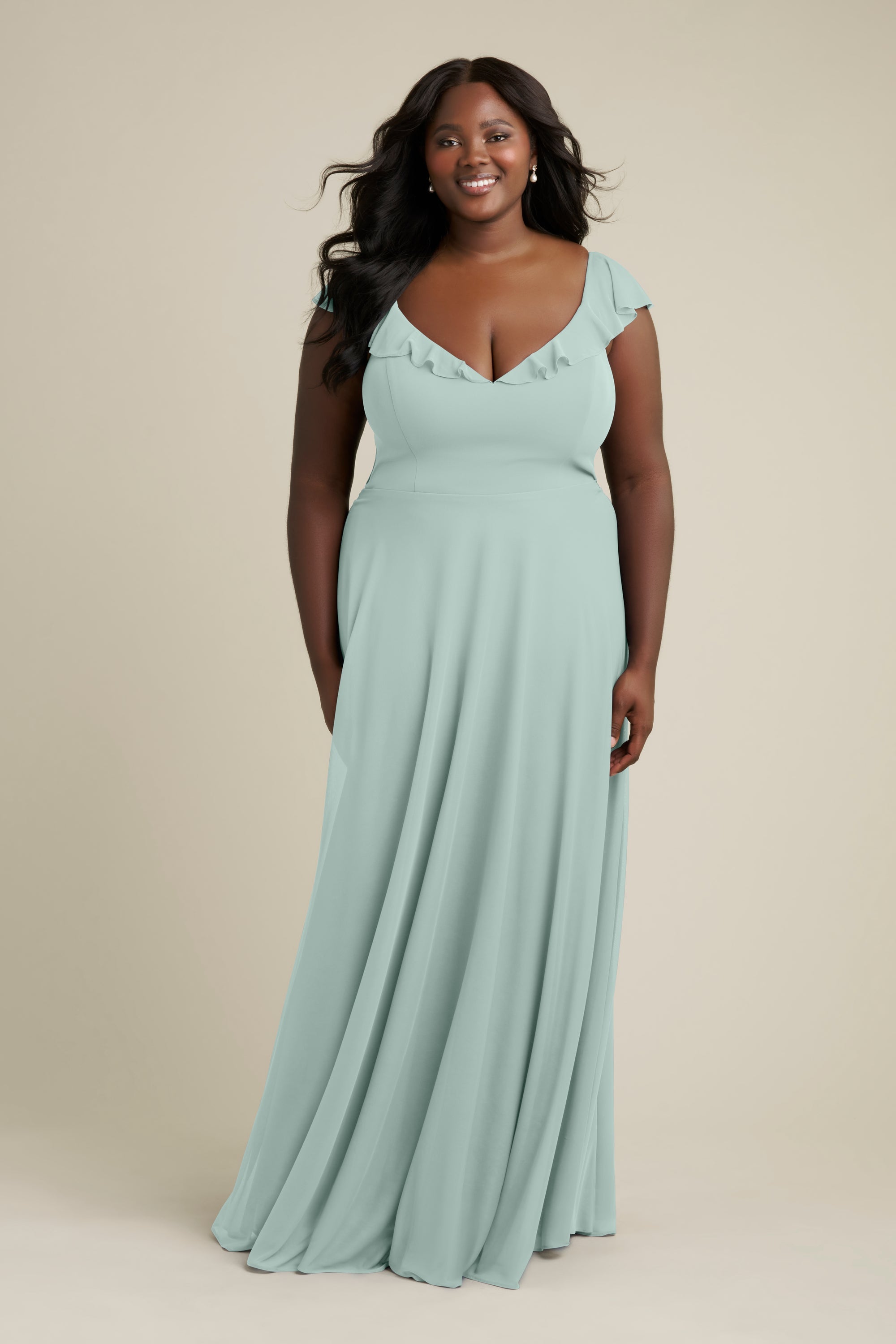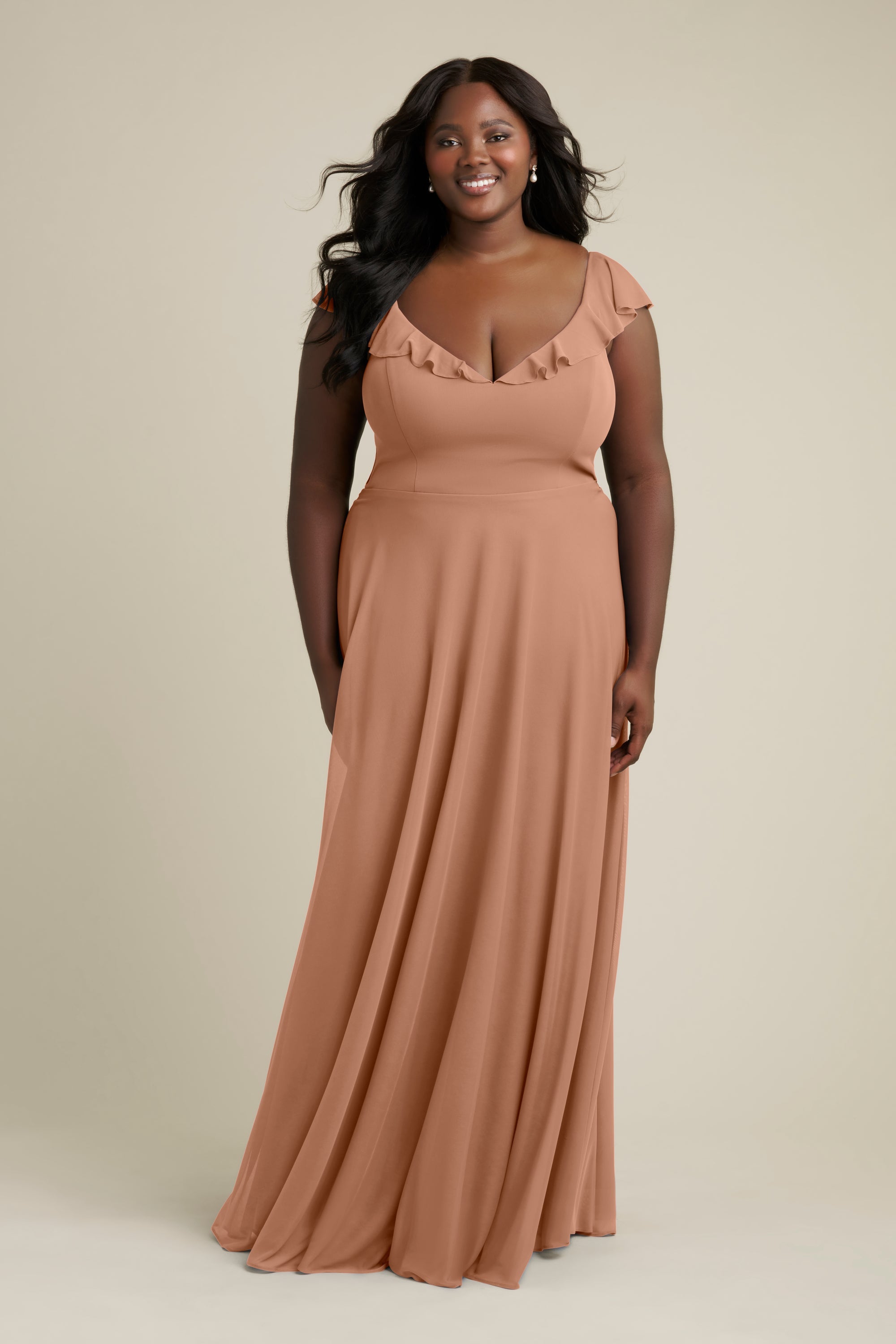 Louisa's delicately ruffled neckline and simple A-line silhouette are accented by a gorgeous tie along the open back.