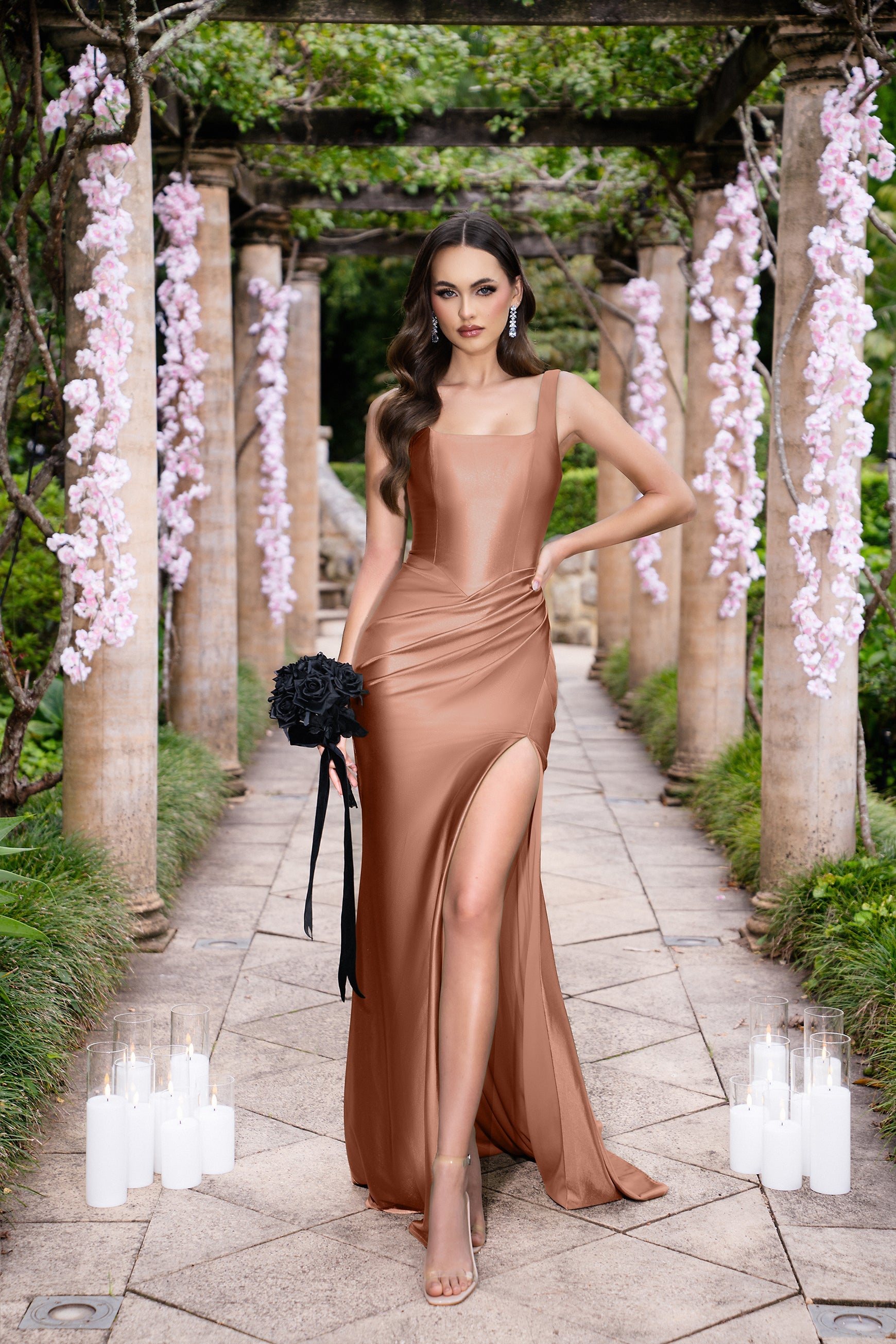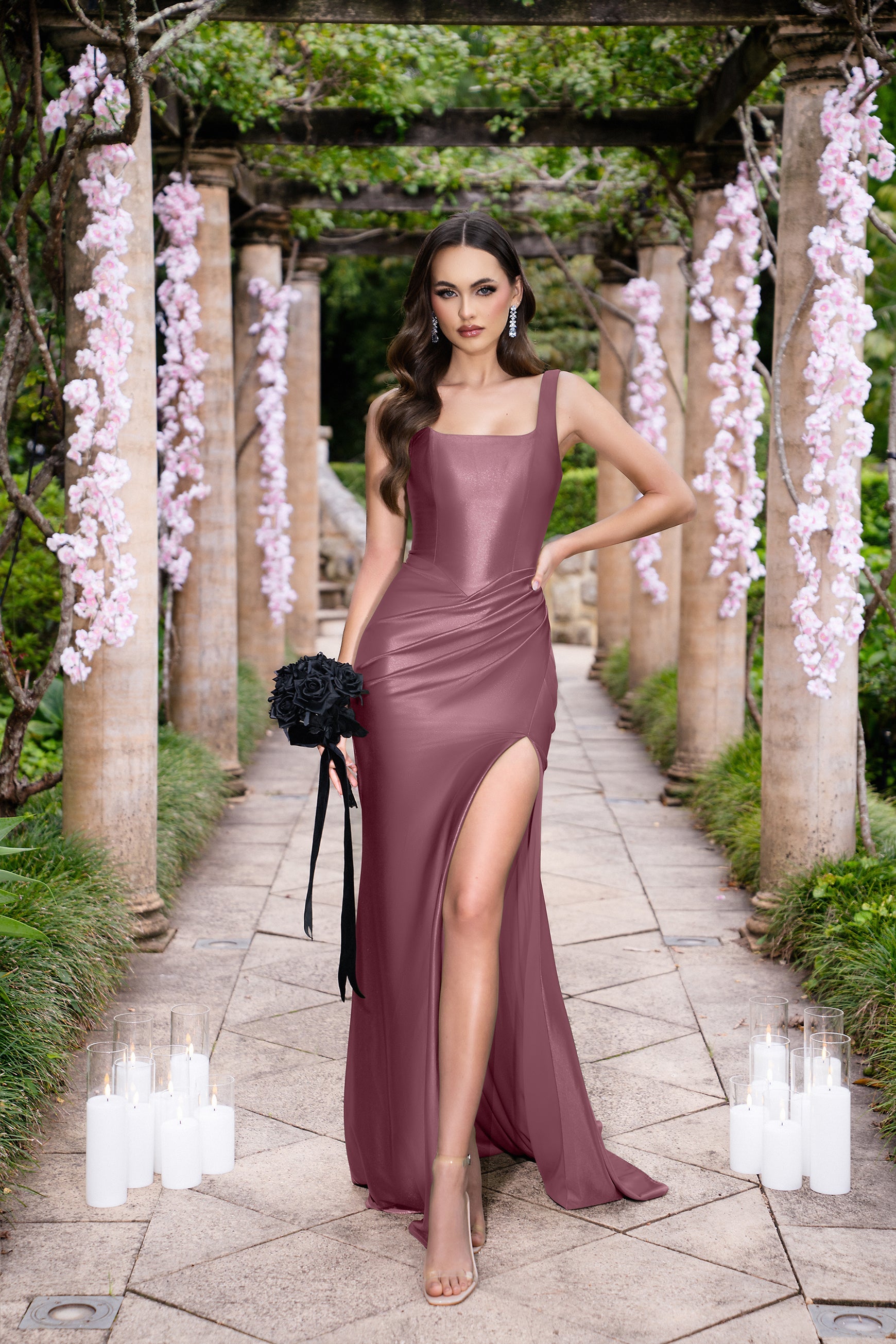 Introducing the Madelyn ‚is a perfect balance of classic elegance and modern allure, designed to make every bridesmaid feel effortlessly chic. The gown features a sleek, straight-across neckline with stylish thick straps for both comfort and support. The flattering waistline dips into a subtle V, while delicate ruching across the stomach enhances your natural shape. A daring high slit adds just the right amount of drama, and the slight train at the back ensures a graceful finish as you move. With its full-length design, the Madelyn offers a perfect fit that is both comfortable and captivating, ideal for a day full of unforgettable moments.