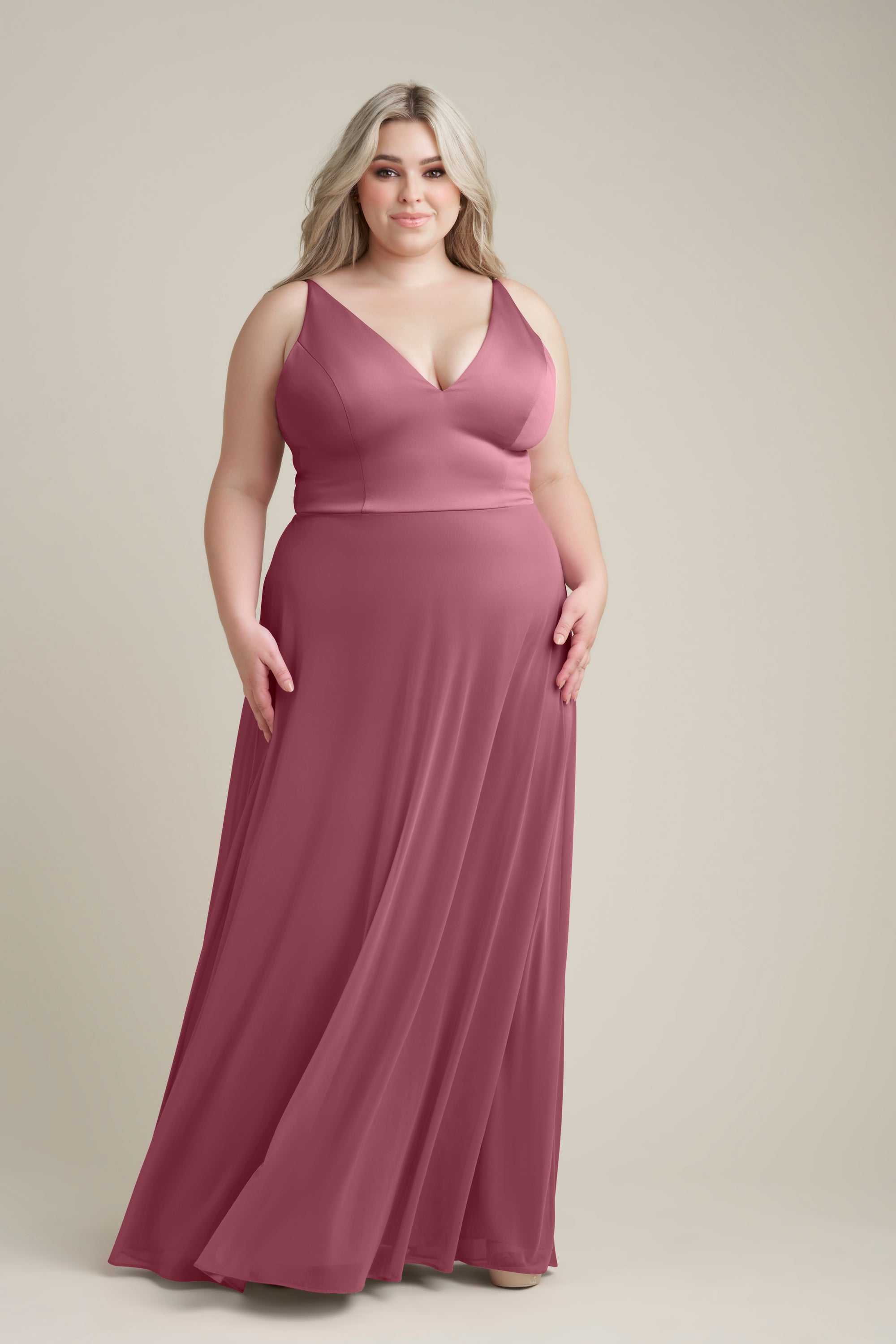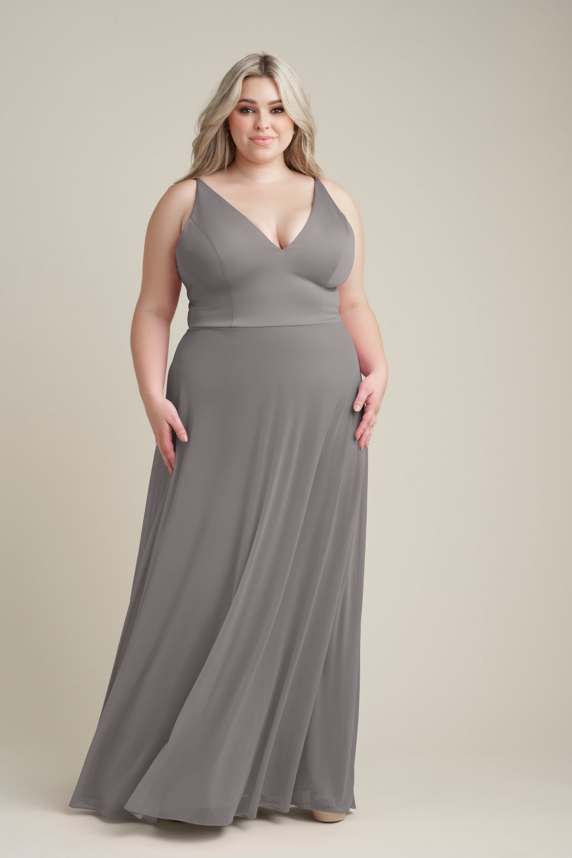 Dreamy Pearl features a V-neck stretch jersey bodice and tie back, leading to an ethereal chiffon A-line skirt.