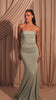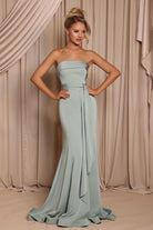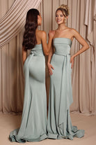 The Peyton Gown is made from stretch satin and features a strapless neckline with a folded trim and fitted bodice. The waist is defined with a tie detail that falls softly to the side, leading into a floor-length skirt with a gentle train. Elegant and refined, it’s a modern choice for bridesmaids.