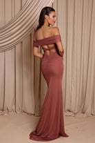 The Zoe Gown is made from stretch chiffon and features an off-shoulder neckline with layered detailing that drapes softly across the bust and arms. The fitted silhouette hugs the figure and flows into a subtle train, while the open back with crossover straps adds a modern touch. A sleek and romantic choice for bridesmaids.